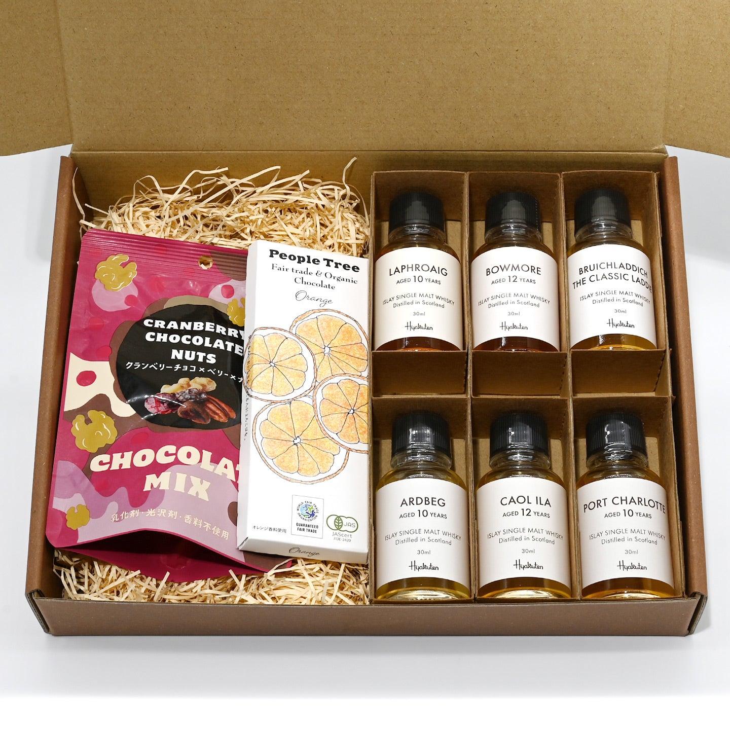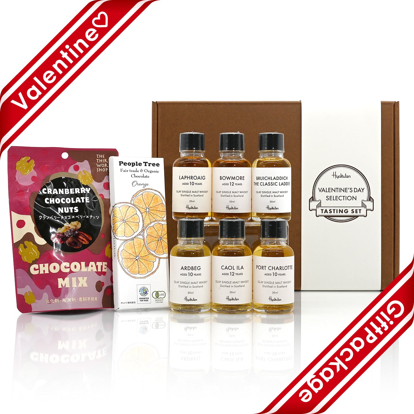 スコットランド・アイラ島の代表的なシングルモルトウイスキーを30mlのボトルに詰め替えたテイスティングセット&ヒャクテンスタッフがセレクトしたウイスキーによく合うチョコレートとナッツ類も同梱した数量限定のバレンタインスペシャルセットです。